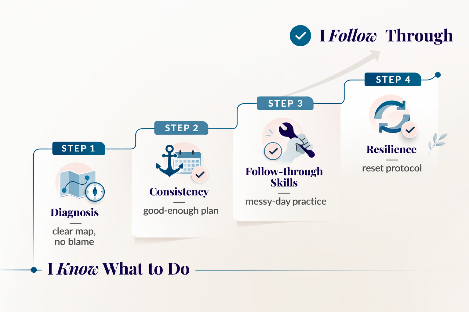 That fear makes sense – especially if you’ve been living in the start-over cycle. This work isn’t built around perfection. It’s built around clean resets and honest adjustments. You’ll learn how to evaluate what happened, change the plan without self-attack, and keep going, so one imperfect day doesn’t turn into two weeks of “screw it.”